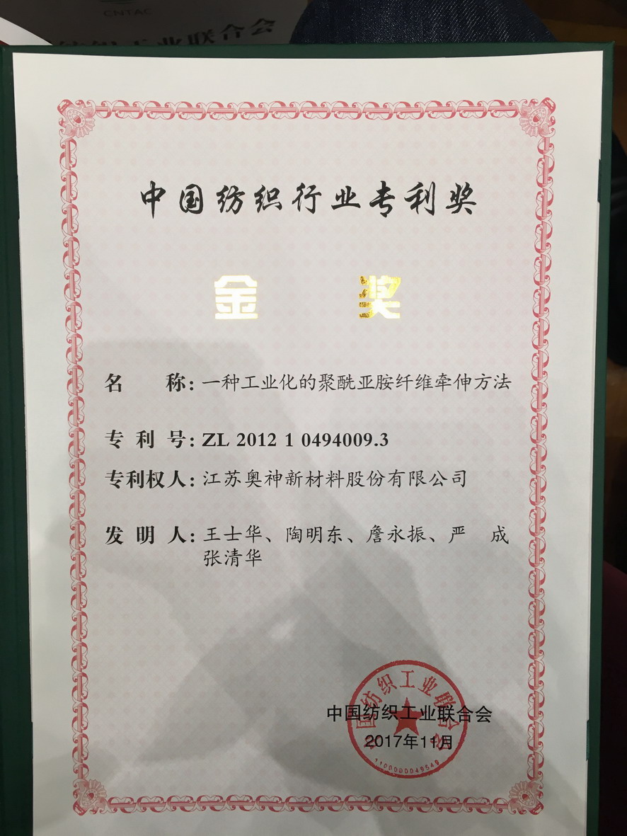会上发布了首届中国纺织行业专利奖、全国纺织科技创新人才等评审结果,安博(中国)官方公司副总经理王士华获得“全国纺织科技创新领军人才”荣誉称号,并作为获奖代表上台发言。江苏奥神新材料股份有限公司发明专利“一种工业化的聚酰亚胺纤维牵伸方法”获得首届中国纺织行业专利奖金奖。