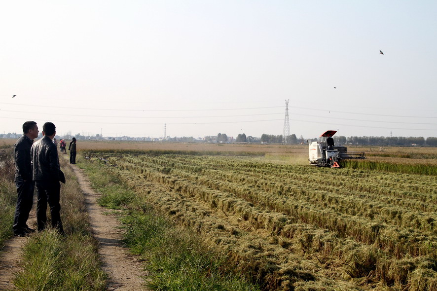 111日下午,连阴后地放睛气温明显回升,盐田稻花香,稻谷归晒场,销售订单忙。在青口公司大新农场的一分场赵斯凯的条田,两台收割机来回穿梭,一片繁忙的景象,全公司近二万亩水稻开始收割。