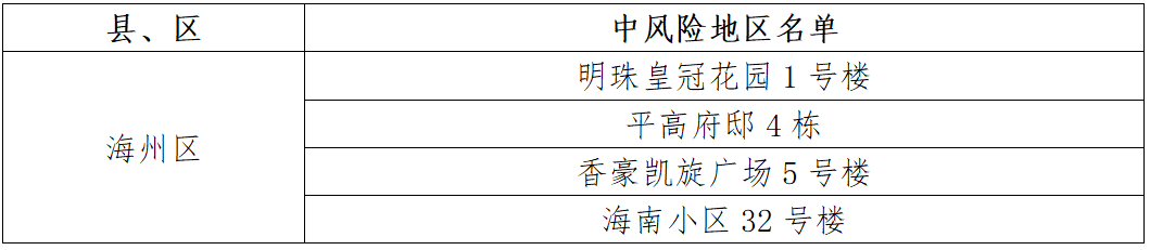 海州区宝泰商住楼、同科汇丰国际A5号楼、御景龙湾D6号楼、香溢世纪花城小区20号楼、馨海名郡18号楼、馨海名郡2号楼、南极南路60-1号楼由中风险地区调整为低风险地区。