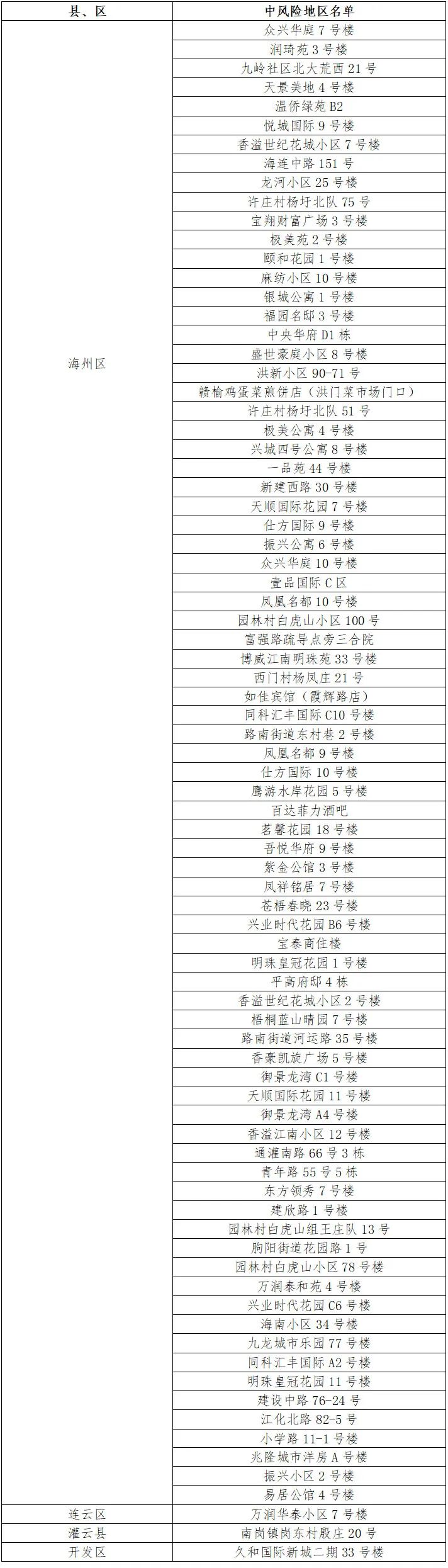 根据国务院联防联控机制有关规定,经综合评估研判,市指挥部决定,自发布之日起,将海州区园林村白虎山组王庄队13号、朐阳街道花园路1号、园林村白虎山小区78号楼、万润泰和苑4号楼、兴业时代花园C6号楼、海南小区34号楼、九龙城市乐园77号楼、同科汇丰国际A2号楼、明珠皇冠花园11号楼、建设中路76-24号、江化北路82-5号、小学路11-1号楼、兆隆城市洋房A号楼、振兴小区2号楼、易居公馆4号楼调整为中风险地区。