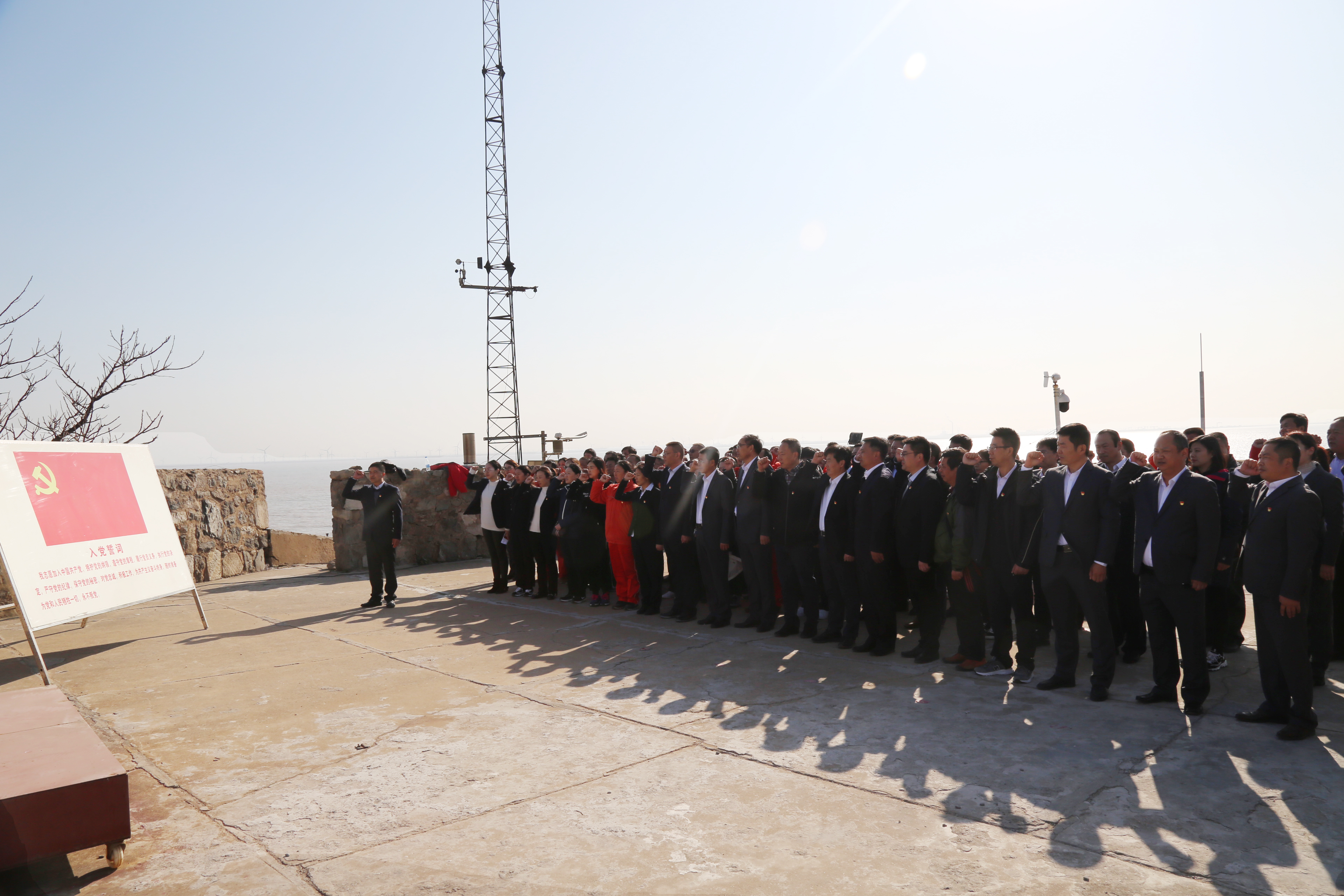 在驻岛讲解员的讲解和带领下,党员们实地感受了岛容岛貌、守岛设施和生活场所,重走了守岛足迹。在王继才先进事迹展示馆,一件件实物和一幅幅图片,生动地再现了王继才“岛就是家、岛就是国”,扎根海岛、献身海防的生平故事,大家被王继才夫妇无怨无悔、坚守付出的爱国奉献精神深深感动。随后来到升旗广场,在王继才铜像和瞭望塔下,部分党员代表重读了“入党志愿书”、畅谈了“三初”体会,全体党员在鲜红的党旗前,再次发出为共产主义奋斗终身的响亮誓言。