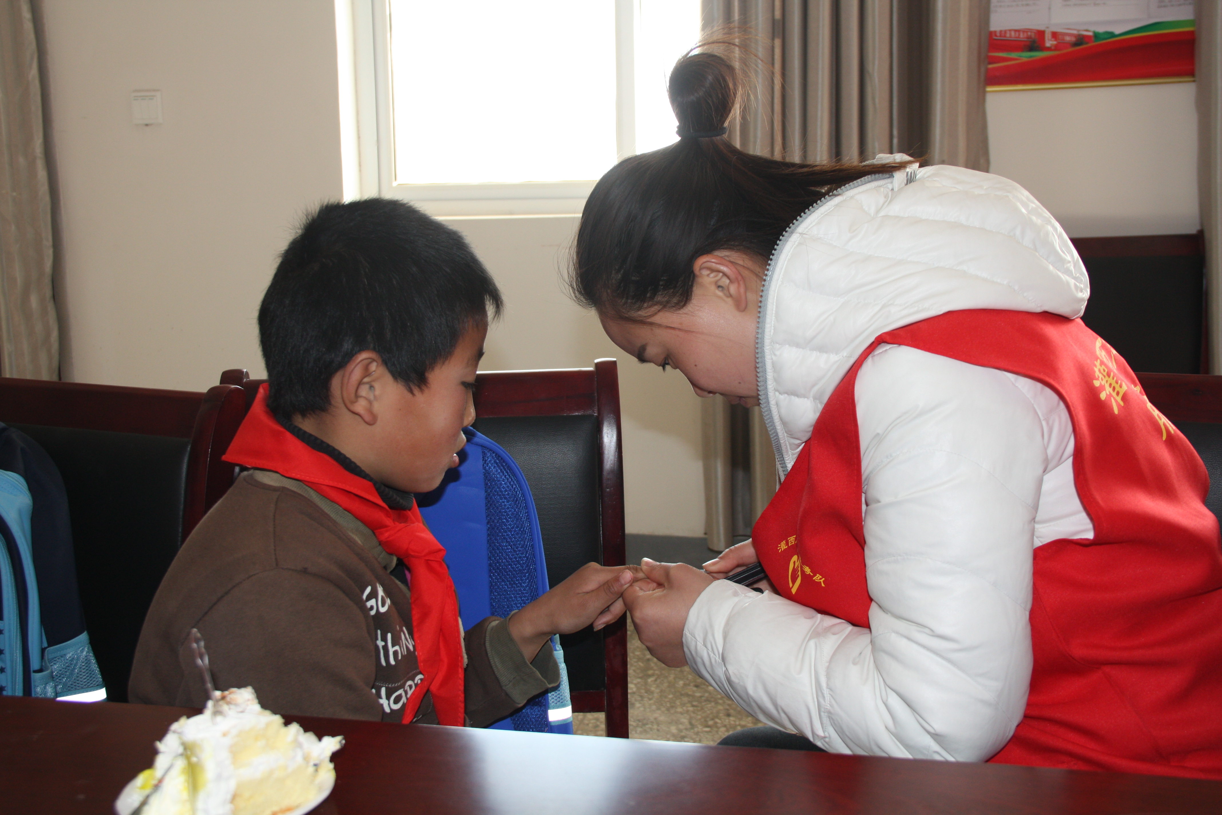 同时,志愿者们还把准备好的书包文具等学习用品送到孩子们的手中,孩子们为志愿者配戴红领巾,并一一结对合影留恋,让这初春多了一丝温暖。通过本次活动,让困难家庭儿童收获温暖的同时懂得感恩,并将这份爱心继续传递下去,助力他们健康快乐的成长。