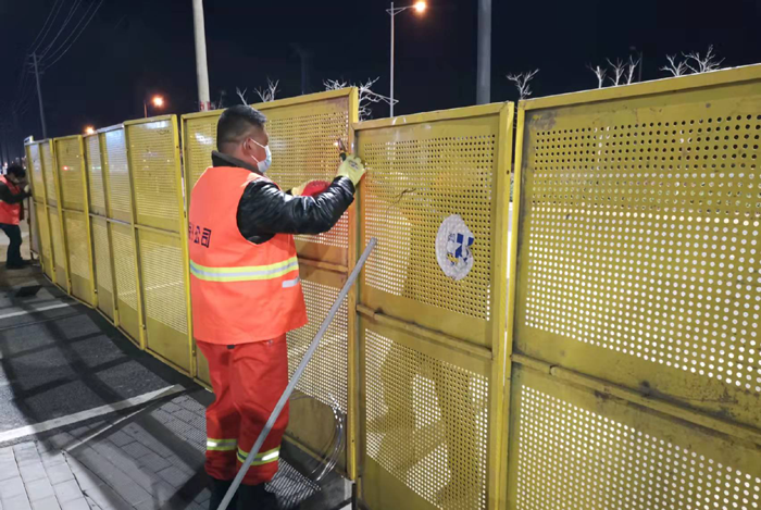 疫情就是命令,防控就是责任,容不得半刻的拖沓。3月5日晚,市政分公司接到围挡安装工程任务后,该公司党员骨干8名突击队员第一时间赶到新区方洋路、环保十路相关路口。突击队克服夜晚视线不好、气温较低等客观困难,加班加点进行围挡安装,历经大家3个多小时的突击工作,完成安装任务。连日来,面对肆意袭来的疫情,工作人员白天黑夜连轴转,任劳任怨,无怨无悔,放弃中午休息,路边解决餐饮,在每一个时间节点按时完成各项安装任务,工作人员用汗水筑起“防疫铁壁”,让疫情“无路可逃”。