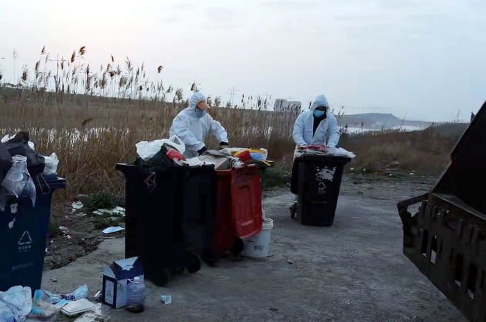 疫情防控期间,保洁分公司要保障徐新路、海滨大道等主干道路及幸福家园及张圩小区周边道路等范围(600多万平方米)垃圾日常清运的同时,要将徐圩新区人民医院核酸检测点垃圾清运到位。他们在共产党员耿恒发的带领下,做好疫情防控措施,早5晚8开展工作。进入三月,天气逐渐转暖,防护服“笼罩”已不是那么舒服,在阳光照射下,汗水很快便浸湿了衣襟,但他们无怨无悔。面对大量检测废物和口罩,带着未知的病毒风险,日清运垃圾30多吨,清理消毒各类垃圾桶600余个。