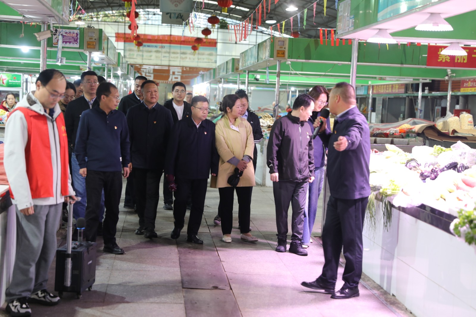 活动中,观摩团沿着精心设计的路线,先后走进四大特色点位,每一处都展现出鲜明的党建特色与发展活力。在金桥房地产公司党总支负责的连云港国际医药创新产业园,“灯塔先锋” 培育对象徐震结合产业园从规划建设到招商运营的全流程,详细分享了党组织如何在产业布局、服务企业、创新发展中发挥 “主心骨” 作用,其 “党建 + 产业” 的融合模式,让在场人员深刻体会到党建引领对产业高质量发展的强大赋能;随后,观摩团来到供电工程分公司党委负责的光伏运维现场,培育对象贺通华以光伏板下的 “红色运维”为主题,讲解了党组织如何带领团队攻克技术难题、保障新能源高效输出,绿色能源与红色党建的碰撞,为大家提供了“双碳”目标下党建工作的新思路;在王建劳模工作室,培育对象王建通过展示技术创新成果、分享师徒传承故事,生动诠释了“劳模精神 + 党建引领”的育人模式,工作室里满墙的荣誉与实用的创新工具,让“精益求精、敢为人先”的精神深入人心;最后一站来到了金航公司巨龙农贸市场,培育对象韩永跃围绕“党建+民生服务”,介绍了如何通过党员示范岗、志愿服务队等载体,优化市场管理、提升服务质量,切实保障群众“菜篮子”安全,让党建成果看得见、摸得着。