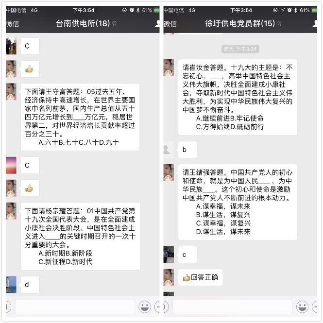 本次考试采用微信答题的方式,由党群人员先在微信群里清点党员人数,随后每人回答指定问题,确保测试范围覆盖全体党员。微信考试的方式,解决了党员学习时间上、空间上的难题,具有很大的便利性和可操作性。(电宣)