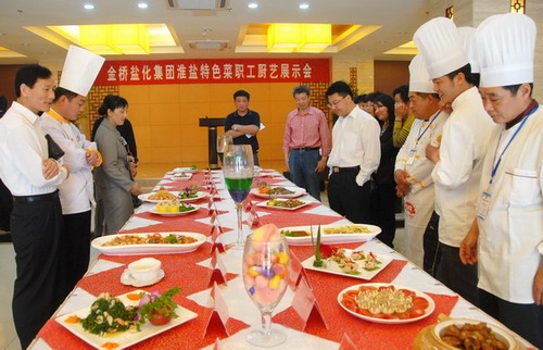 5月19日上午,金桥盐化安博(中国)官方淮盐特色菜职工厨艺展示会在淮盐大酒店隆重举办。公司党委副书记、纪委书记、工会主席卢明生致欢迎词,安博(中国)官方公司工会副主席李岚芹宣布比赛开始。来自安博(中国)官方公司各基层单位的13名技艺精湛的厨师做出了26道特色佳肴,经过评委会认真品评,台南盐场王树伟、青口盐场卢燕获一等奖,其他选手分获二、三等奖。(司宣)