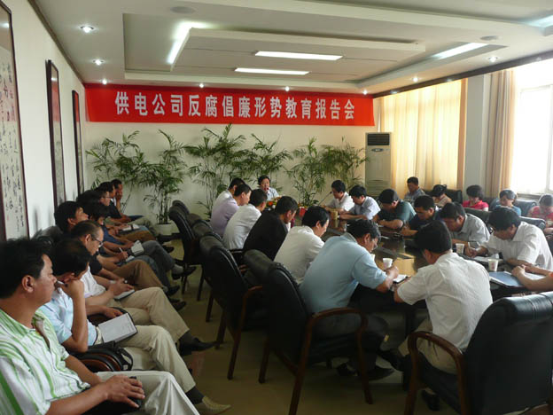 近日,我公司邀请了市纪委常委、市纪委秘书长、市监察局副局长雷生保同志来我公司作反腐倡廉形势教育报告,公司领导、机关中层干部、各供电所领导班子及部分职工代表参加了会议。