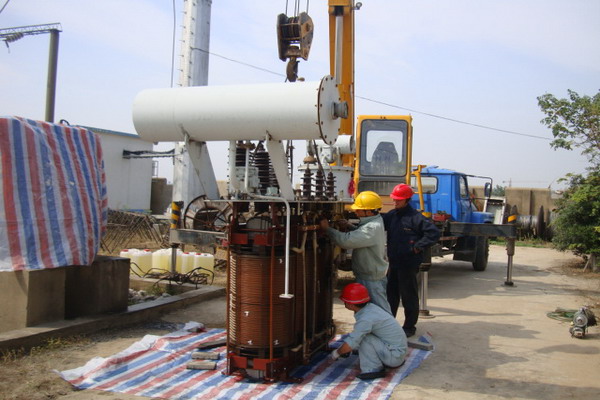 10月6日,台北供电所抓住用电低峰,对两台3150千伏安和2500千伏安主变压器进行养护维修,以确保节后高效、平衡、安全供电。(李吉成)