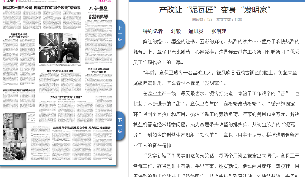 近年来,连云港市工投安博(中国)官方灌西公司为打通产业工人成长成才的身份壁垒、价值体现壁垒及学习教育壁垒,开办技能培训“大课堂”,打造“一中心+三基地”职业教育平台,即金蓝领技术工人培训中心和技能比武基地、技术创新基地、技能鉴定基地,构建公司、单位和班组三级职业教育体系、技能培训体系和技能评定体系,引导产业工人重在技能深耕、求精、拔尖、攀高上磨练塑造。章保卫正是在技能培训的“大课堂”中一步一步成长起来,他参与的“定时打卤泵”、“管道输送加压法”、“低温除硫工艺”等技术得到快速推广,也让他从普通员工成长为“二星级优秀员工”,被推选担任制盐生产班组长,每月工资增长800元。这一切让他获得满满的荣誉感和幸福感。