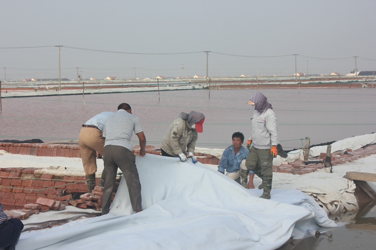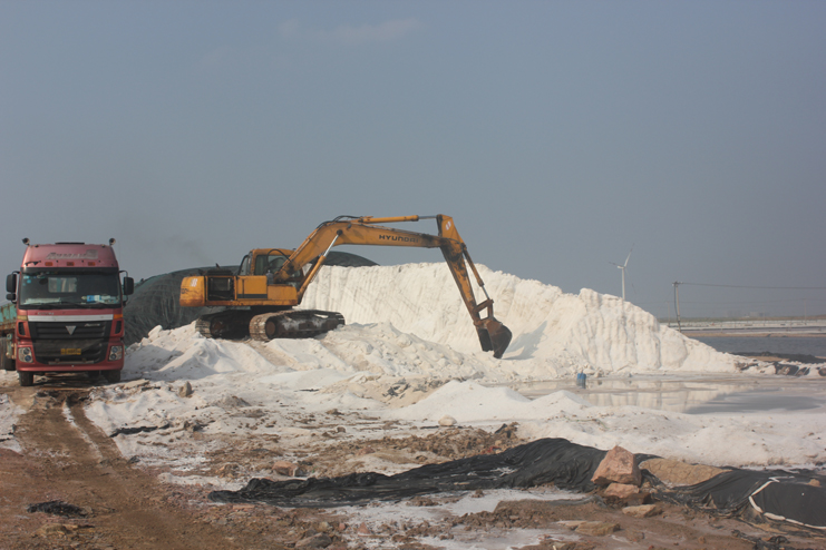 随后安博网页版又来到了新河制盐分公司十四班的装盐现场。一位工人操作着挖掘机,往卡车上装盐销售,如今装盐实现了机械化,工人的劳动负荷也减轻了许多。在埒南制盐分公司的五班,安博网页版看到七八个工人正在滩头更换土工布,他们一字排开,先将土工布铺开,然后分工合作,有的人负责把布理齐铺平,有的则把砖头铺放在布上用来固化。