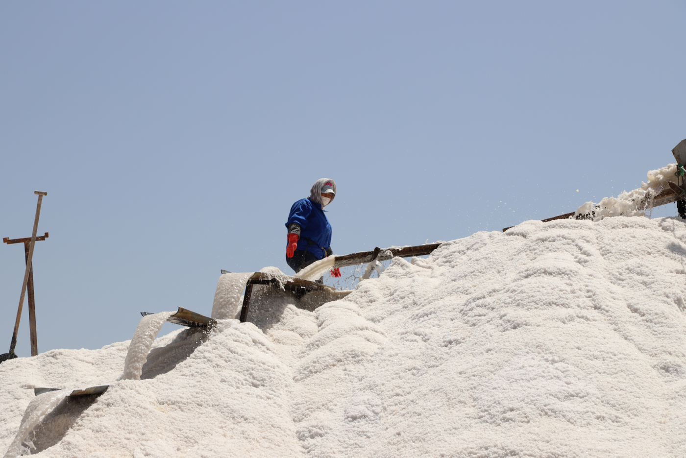 在新河十一班,扒盐工作正在紧张的进行之中,两名员工在盐廪上挥舞着木锹,搬送着淌盐的导流板做盐廪,扒盐员工跟时间赛跑,24小时不停机3班倒开机扒盐,紧紧抓住当前生产经营的黄金季节,抢抓扒盐进度,坚决实现时间任务双过半。