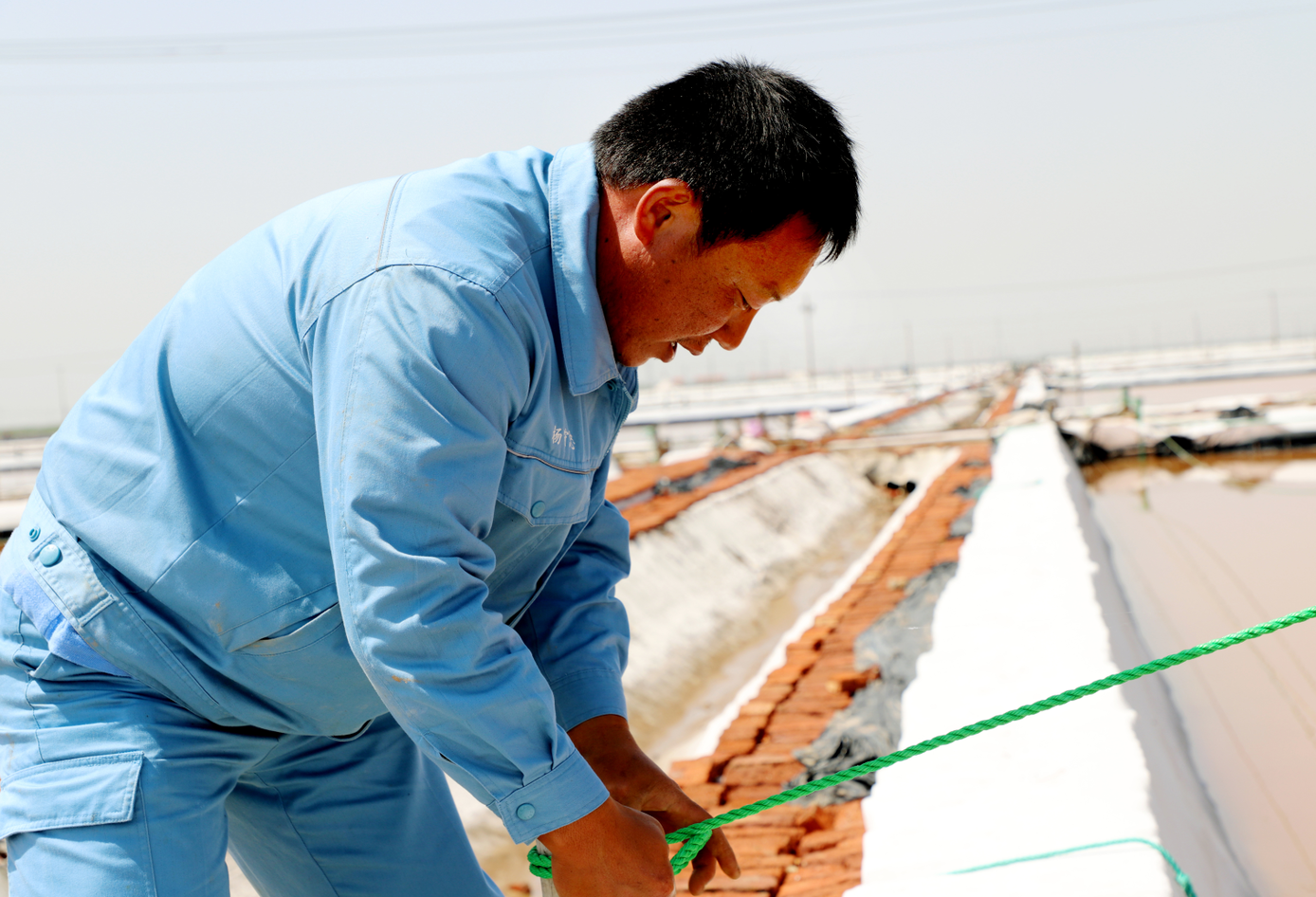 在新河的八班,员工有的在补塑料布,有的在疏通排水沟道,整理绳索,也是忙的热火朝天。为了抓好二季度工作,八班以生产合格原料食用海盐为目标,紧抓有利天时,进一步创新海矿卤勾兑制盐工艺,细化工作措施,责任到人,着力提升原盐质量和产量,目前已生产海水盐4000吨。