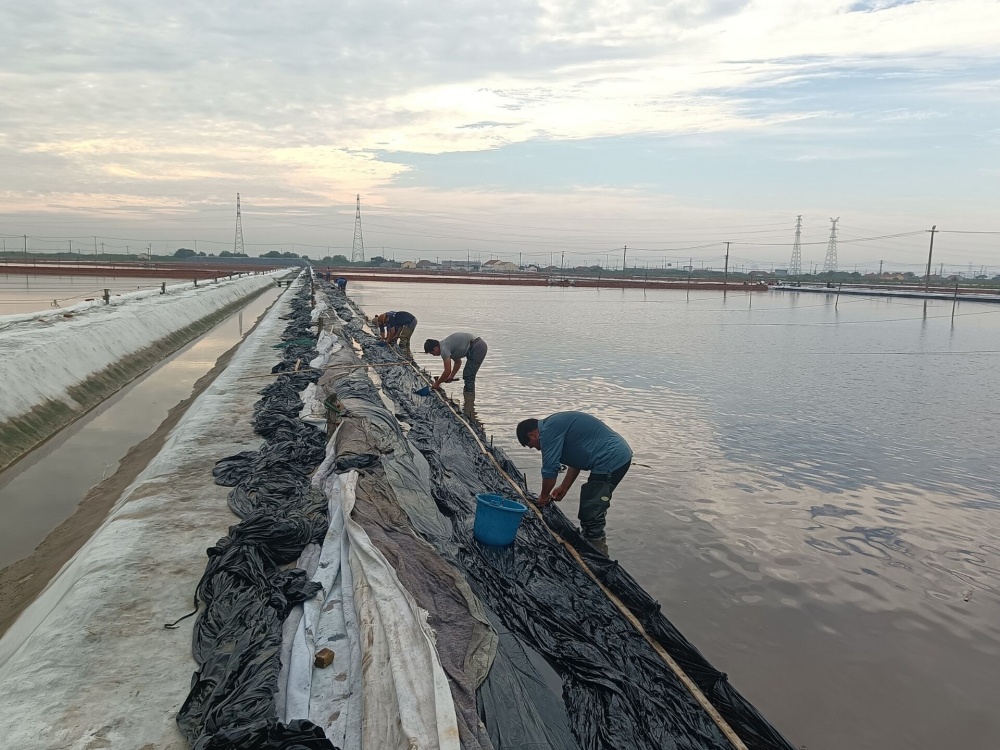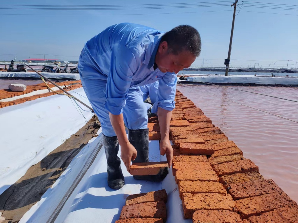 鏖战酷暑,保目标。当前,正是原盐生产的关键时期,面对高温酷暑的严重考验,该公司干部职工迎难而上,战高温斗酷暑、抢晴天保生产,全力投入到高温生产、保盐保卤等工作中,及时修补塑布,加强塑布收放系统维护保养,随时做好拉塑布准备工作;管理人员以上率下,实施24小时现场值班机制,强化除硫制盐工艺,抓实抓细原料卤水、结晶池等源头过程管控,确保全年产盐60万吨。骄阳烈日下,万亩银滩卤水潺潺、“五彩斑斓”,产业工人在39℃高温的户外劳作,在热气蒸人的卤水盐田里,挥汗如雨,构成了一幅最美的“卤上芭蕾”。(许东彦)