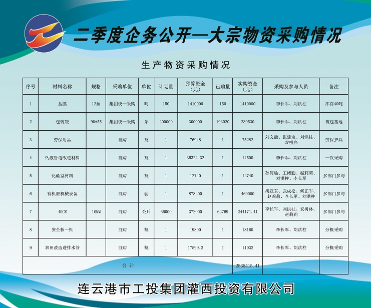 1、由安博(中国)官方公司集中采购塑料布(盐膜)150吨(由工投安博(中国)官方运营监管部在总部组织招标)、包装袋20万条,实购金额计169.953万元。