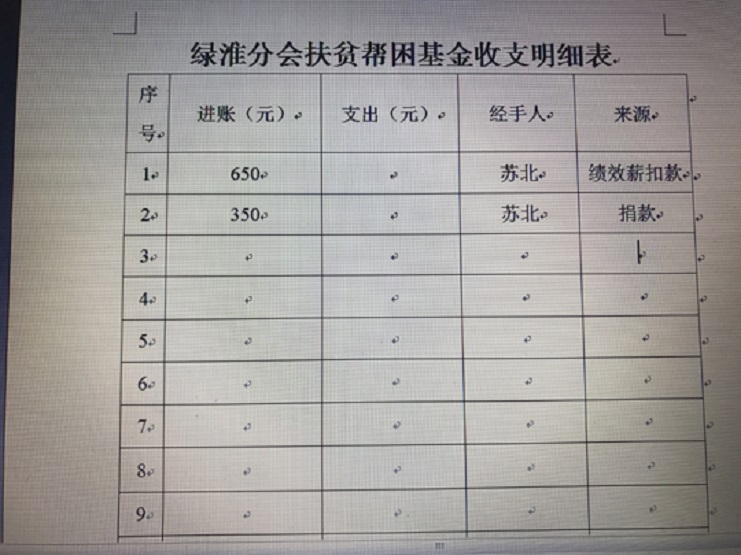 7月27日,绿淮公司出纳将1000元现金汇入专有账户,标志着分会成功引入第一笔扶贫基金。 据了解,绿淮扶贫基金由员工当月扣罚的绩效薪以及自愿捐款、募捐等形成组成的一项专项资金,主要用于深入开展“双进双促”,力所能及地帮扶特困户、困难户,做好职工的贴心人,为早日实现魅力灌西添砖加瓦。(苏北)