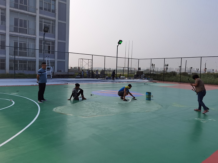 灌西篮球场总面积约510平米,附属球场地面600平米,外围护栏高3米。项目围绕关键节点及重难点,强化施工组织,统筹施工进展。篮球场地面露天暴晒,温度极高,仿佛蒸笼一般。施工人员在进行凿地、涂漆时,仅几分钟的功夫,衣服从里到外被汗水浸湿,随时有中暑的可能性,项目组把责任明确到个人,开展班前安全教育活动,保证施工安全。施工单位南翼工程公司负责人钱明伟克服人员紧缺,工期紧迫等问题,顶着高温,始终奋战在工程项目第一线。