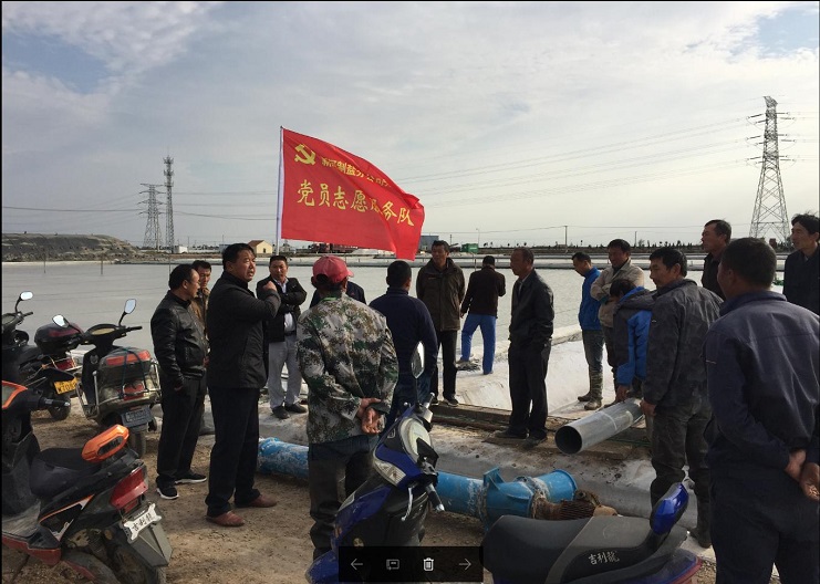 该公司八名党员班长为展示支部党员突击队作用,增强党员标杆作用和服务意识,将鲜红的支部党员志愿服务队旗插在了零班的滩头。(新河制盐 邱利民)