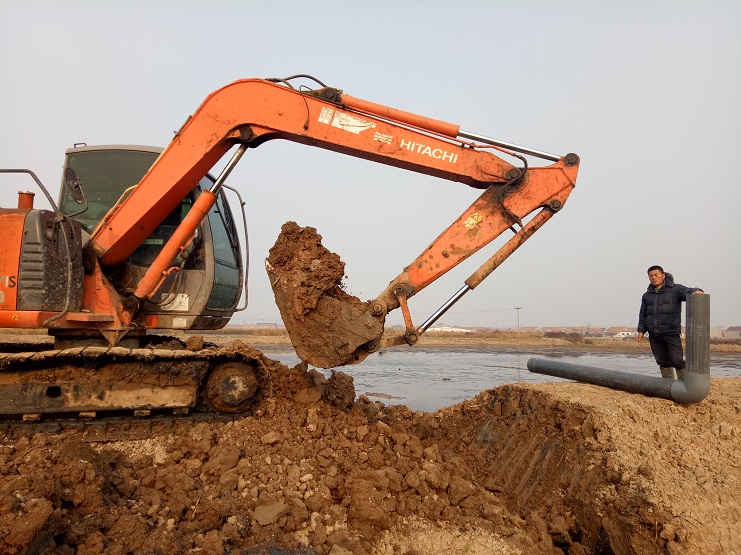 为了加大滩场改造力度,尽早将海水顺畅的引进滩地、卤滩及时排淡,近日,实业公司制盐分公司海盐基地三班班组,忙着下进排水管道。三班班长金立柱更是早出晚归,望改造的滩场早日投入生产。(图为三班班长正准备下管道)。 (实业公司)