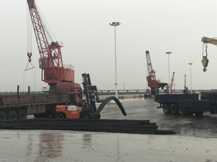 “战高温,迎酷暑”,宵洋码头从早上开始就忙得如火如荼。装载管桩的货船进入码头,工人们就开始操作着塔吊,稳稳当当的将管桩“放”入货车。货车装载的盘螺,钢筋也纷纷到码头场地上装卸。一切工作都井然有序的进行着。 随着气温不断的攀高,天气开始变得闷热起来,7月25日下午,伴随着雷鸣,一场期望已久的“及时雨”滂沱而至,冲走了高温,带来了短暂的凉爽。然而奋斗在码头一线的员工们并没有停止他们手上的工作,却想着趁着这会儿能够多干一些。即使仍下着小雨也影响不了他们开着叉车装载货物到货车上。(宵洋 张宝同)