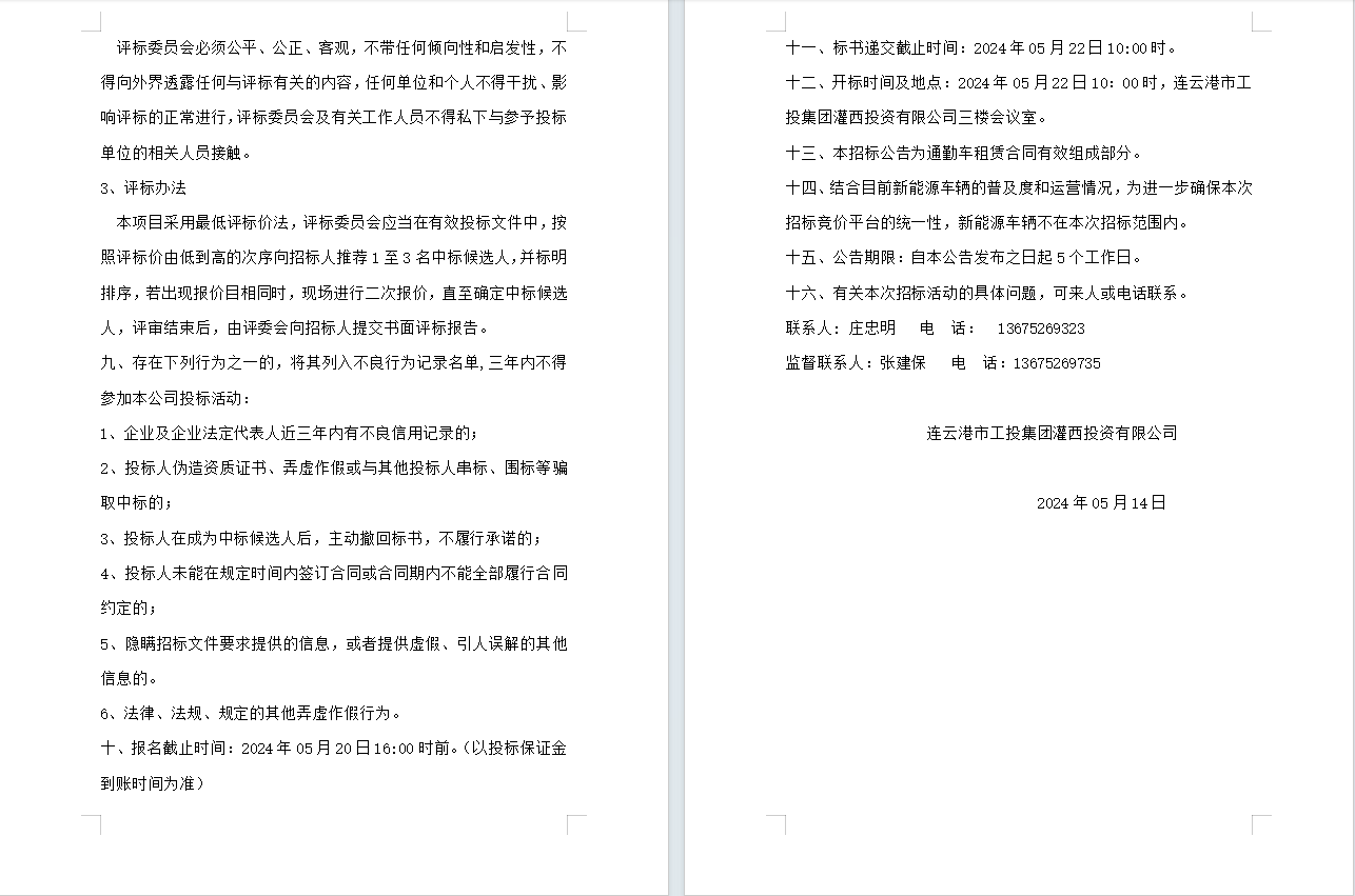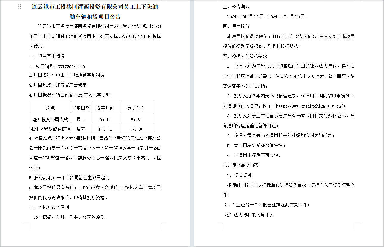 连云港市工投安博(中国)官方灌西投资有限公司员工上下班通勤车辆租赁项目公告