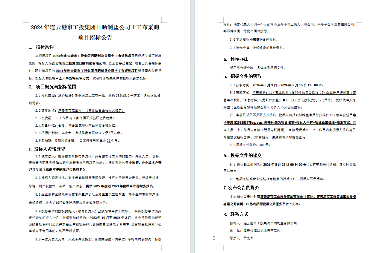2024年连云港市工投安博(中国)官方日晒制盐公司土工布采购项目招标公告