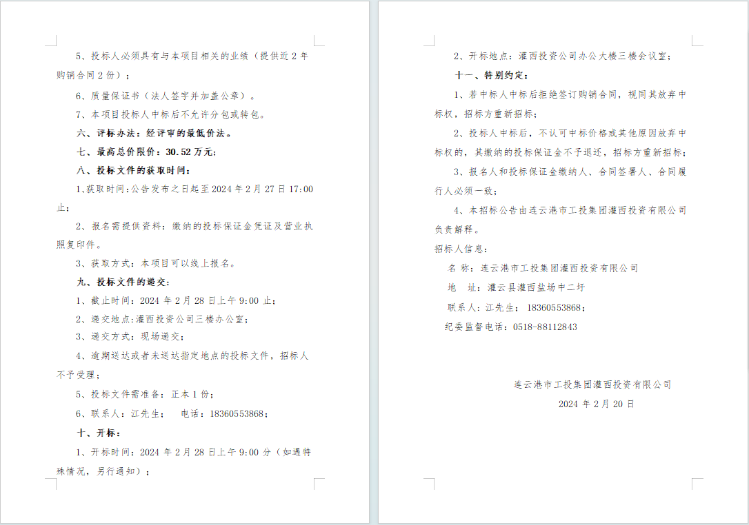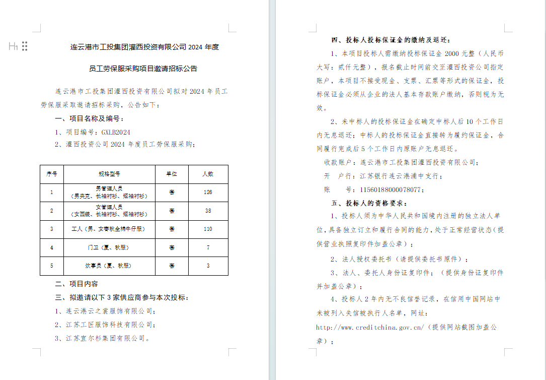 连云港市工投安博(中国)官方灌西投资有限公司2024年度员工劳保服采购项目邀请招标公告