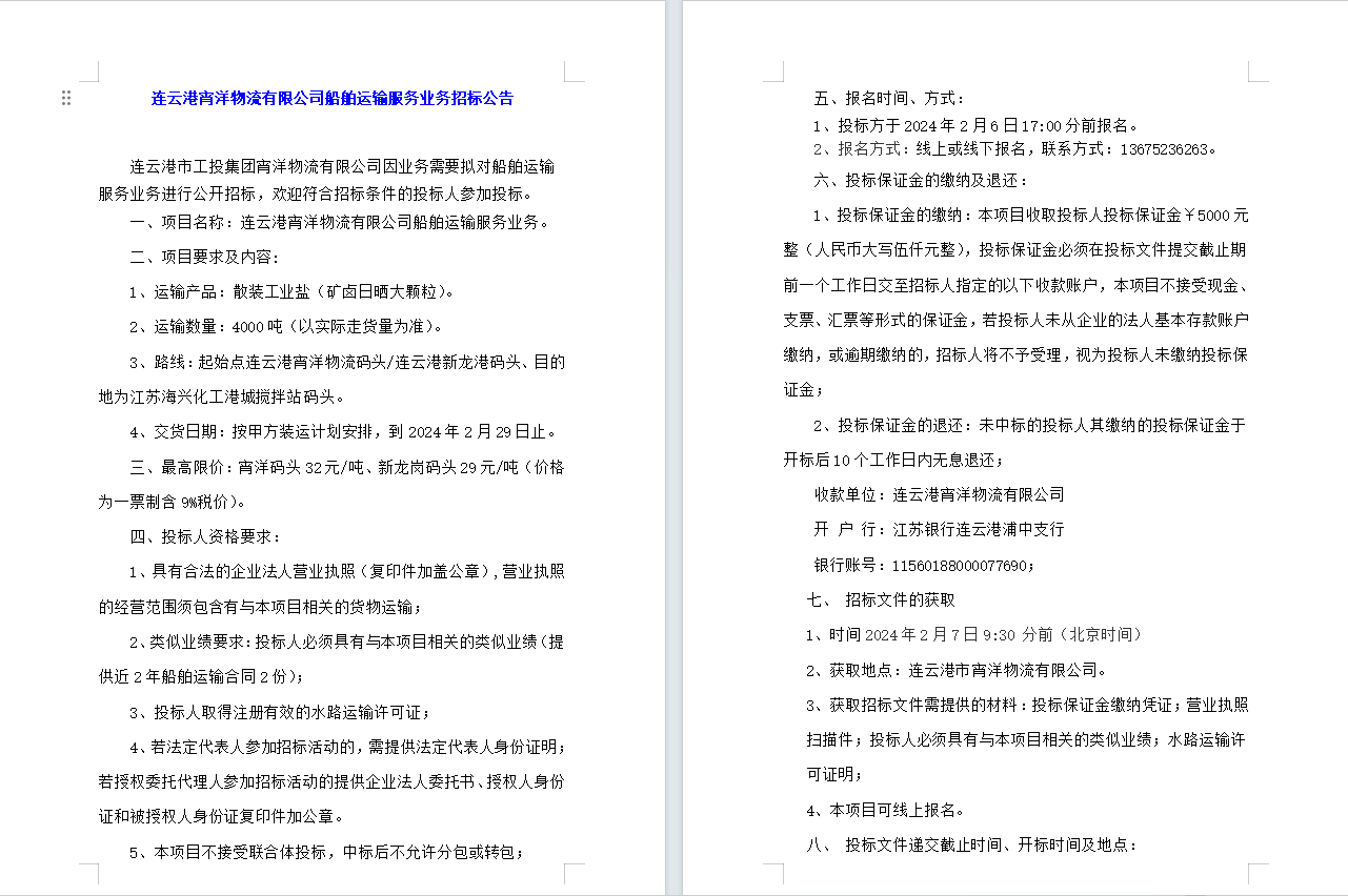 连云港宵洋物流有限公司船舶运输服务业务招标公告