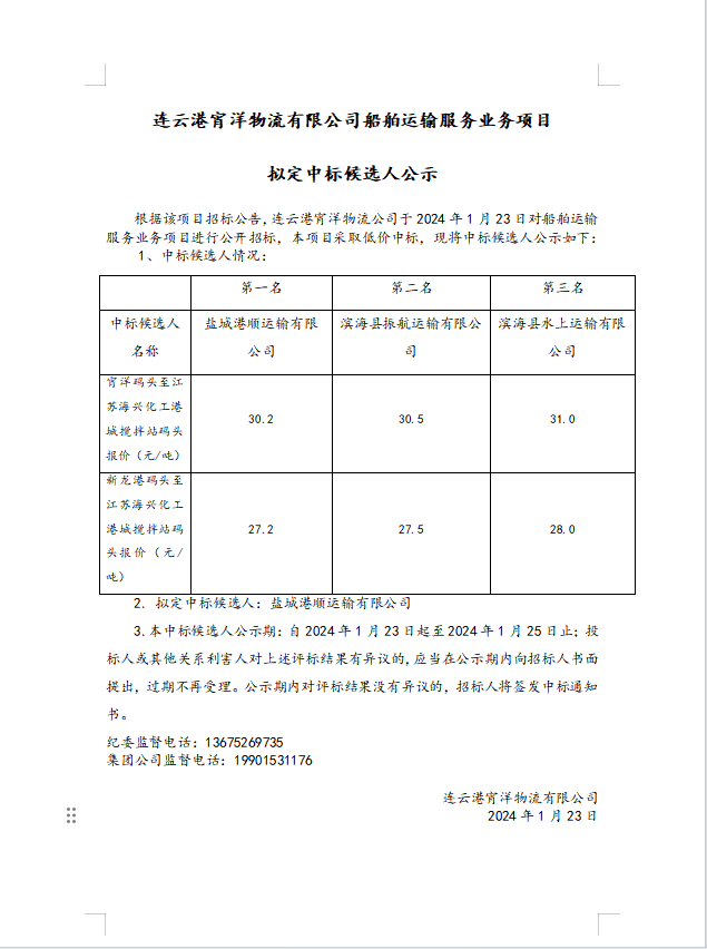 连云港宵洋物流有限公司船舶运输服务业务项目拟定中标候选人公示