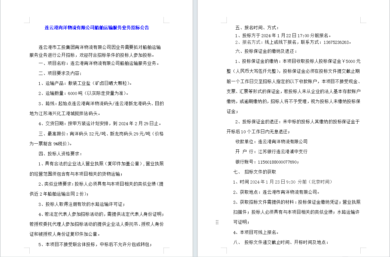 连云港宵洋物流有限公司船舶运输服务业务招标公告