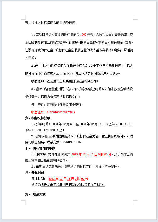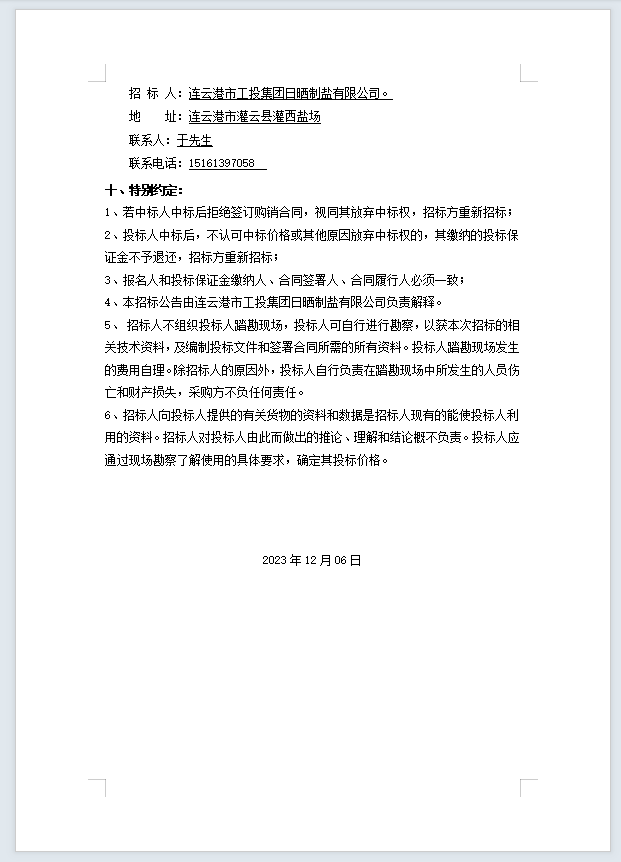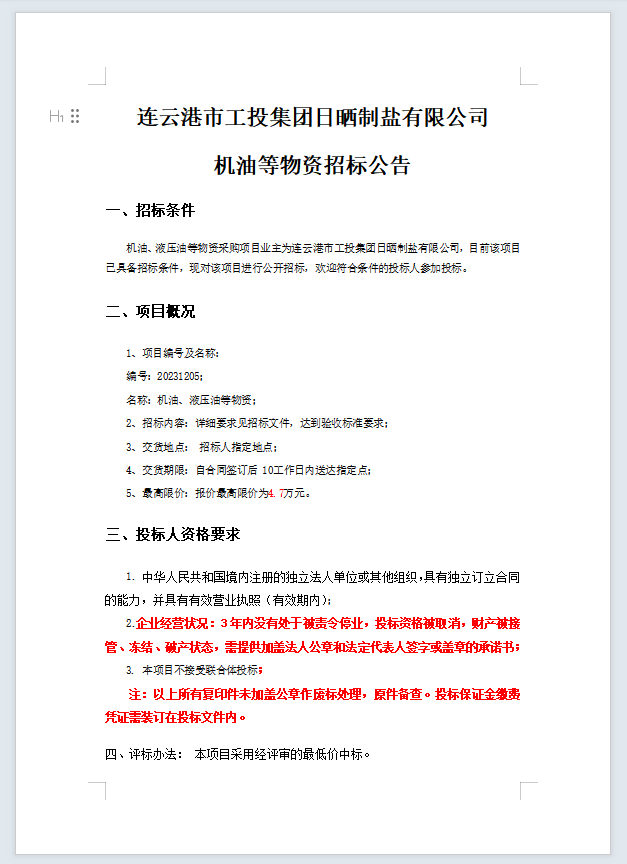 连云港市工投安博(中国)官方日晒制盐有限公司机油等物资招标公告