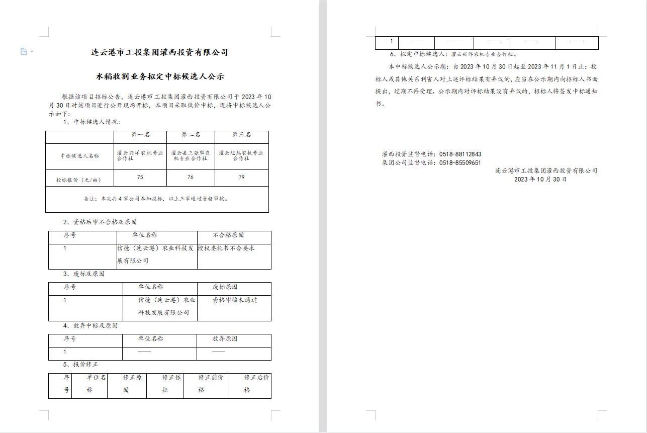 连云港市工投安博(中国)官方灌西投资有限公司水稻收割业务拟定中标候选人公示