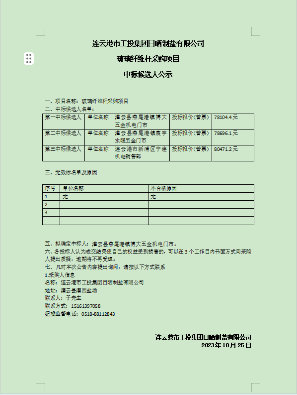 连云港市工投安博(中国)官方日晒制盐有限公司玻璃纤维杆采购项目中标候选人公示
