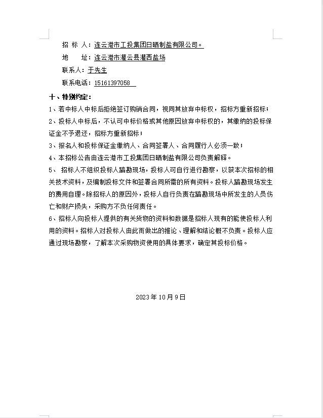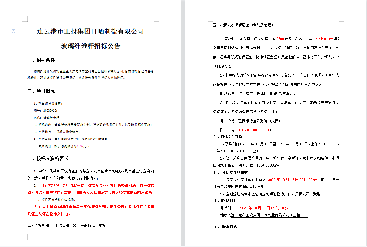连云港市工投安博(中国)官方日晒制盐有限公司 玻璃纤维杆招标公告