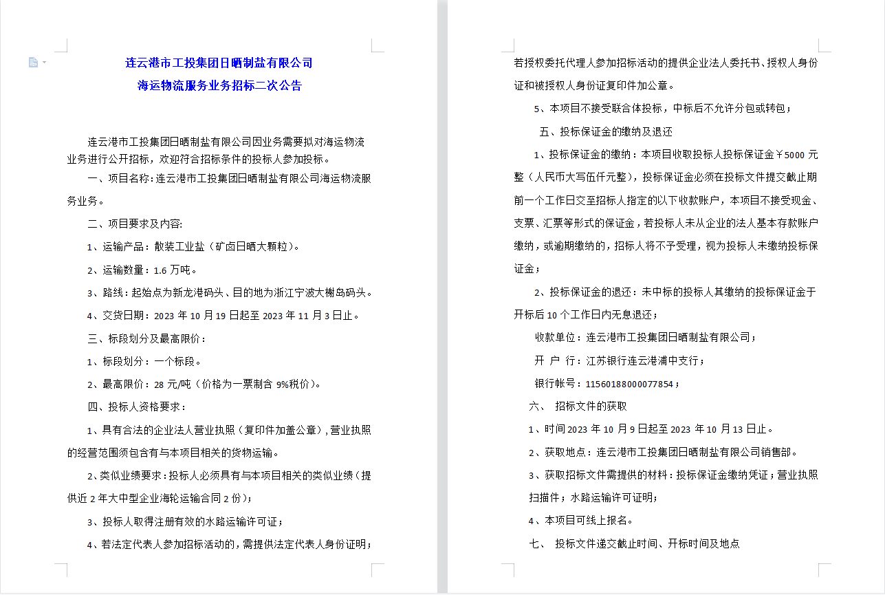 连云港市工投安博(中国)官方日晒制盐有限公司 海运物流服务业务招标二次公告