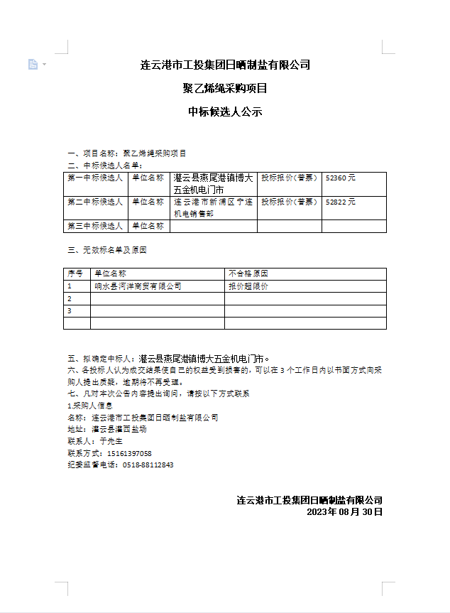连云港市工投安博(中国)官方日晒制盐有限公司聚乙烯绳采购项目中标候选人公示