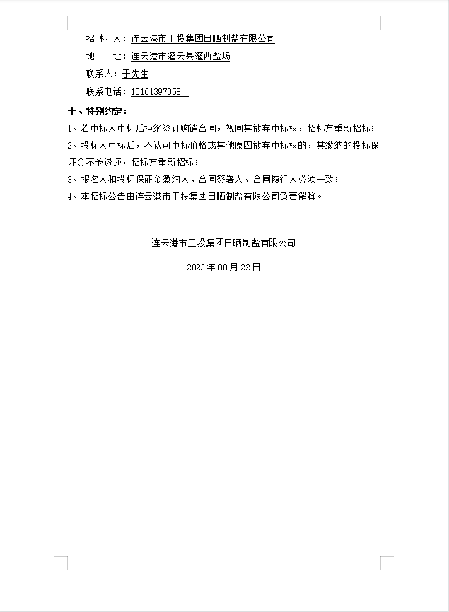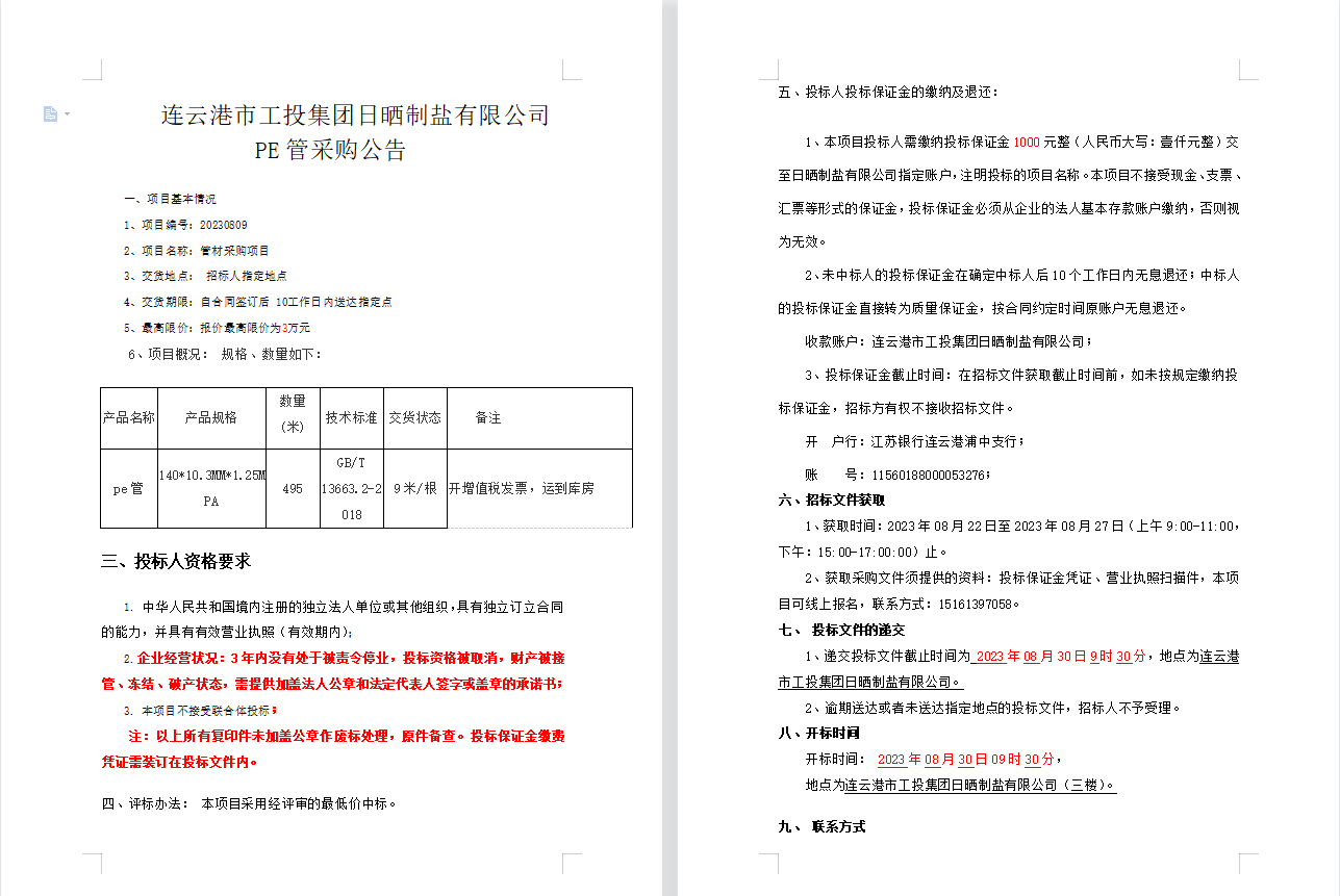 连云港市工投安博(中国)官方日晒制盐有限公司PE管采购公告