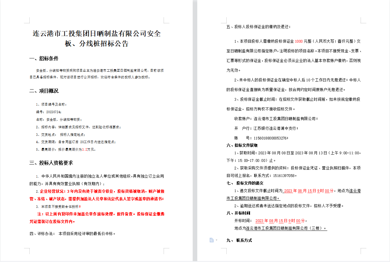 连云港市工投安博(中国)官方日晒制盐有限公司安全板、分线桩招标公告