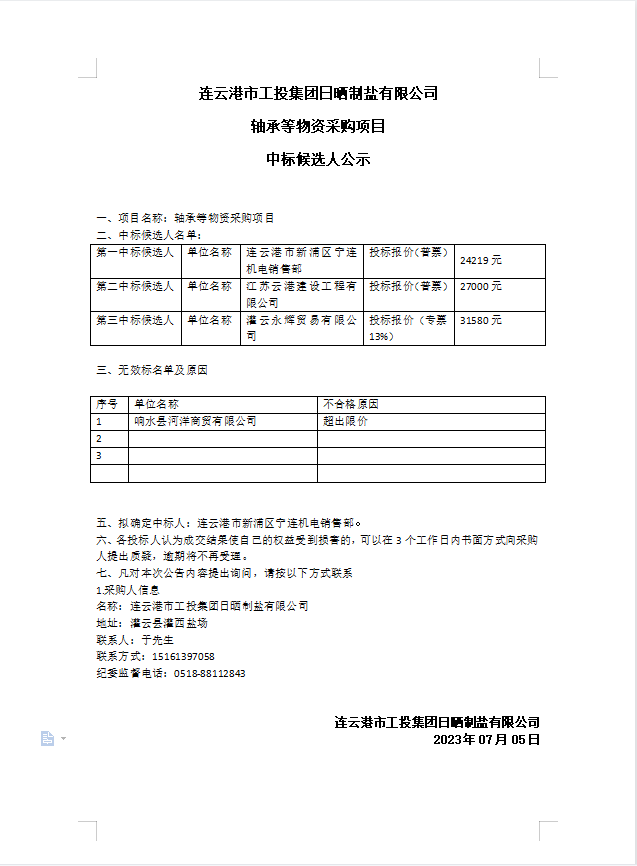 连云港市工投安博(中国)官方日晒制盐有限公司轴承等物资采购项目中标候选人公示