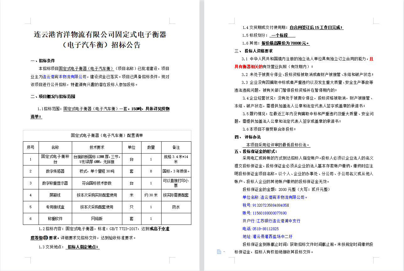连云港宵洋物流有限公司固定式电子衡器(电子汽车衡)招标公告