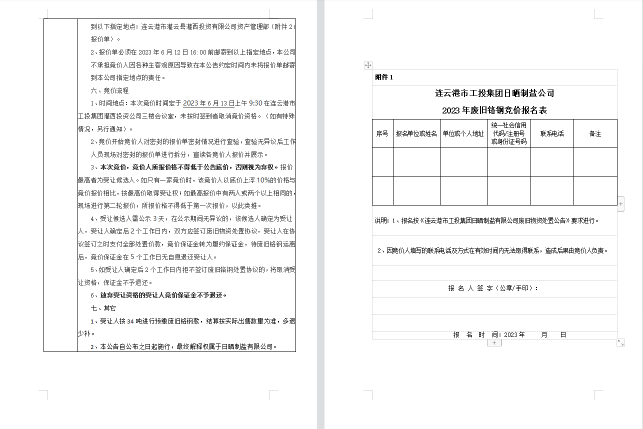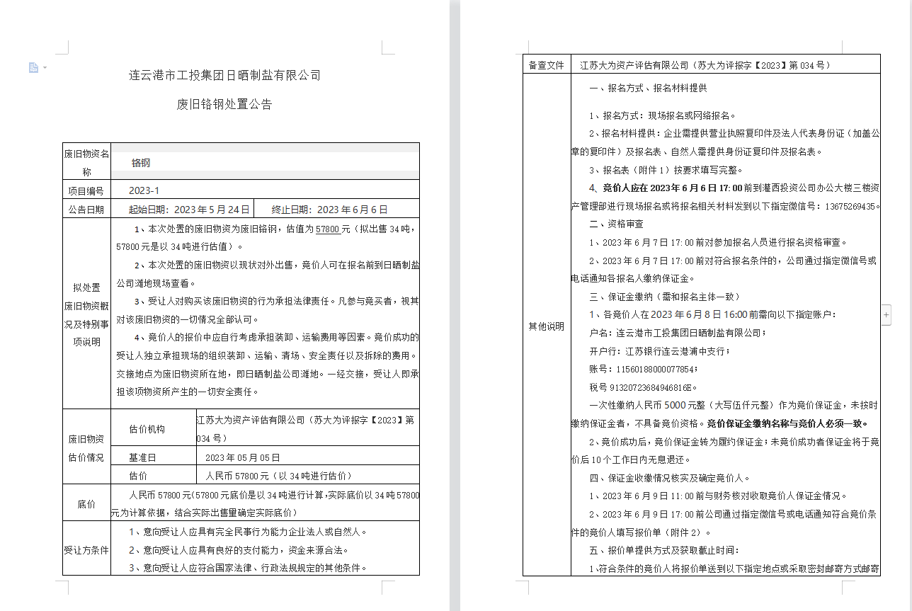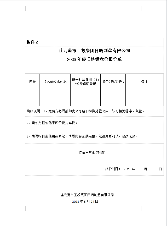 连云港市工投安博(中国)官方日晒制盐有限公司废旧铬钢处置公告