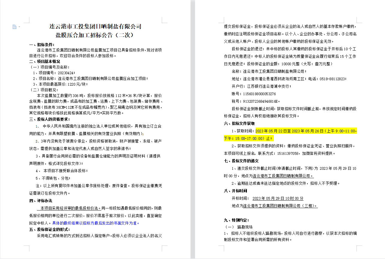 连云港市工投安博(中国)官方日晒制盐有限公司盐膜压合加工招标公告(二次)