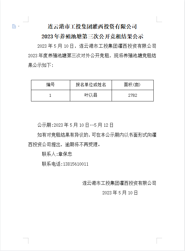 连云港市工投安博(中国)官方灌西投资有限公司2023年养殖池塘第三次公开竞租结果公示