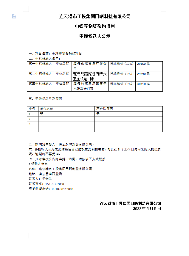连云港市工投安博(中国)官方日晒制盐有限公司电缆等物资采购项目中标候选人公示