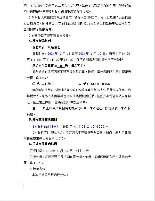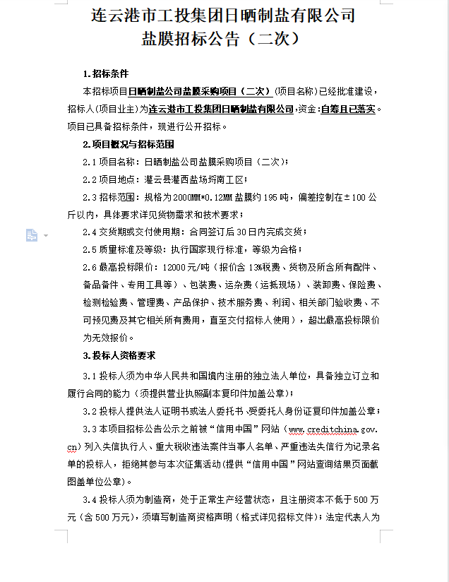 连云港市工投安博(中国)官方日晒制盐有限公司盐膜招标公告(二次)