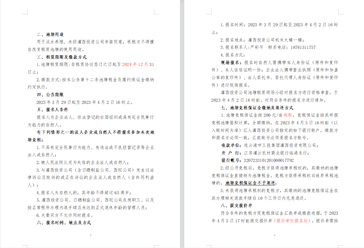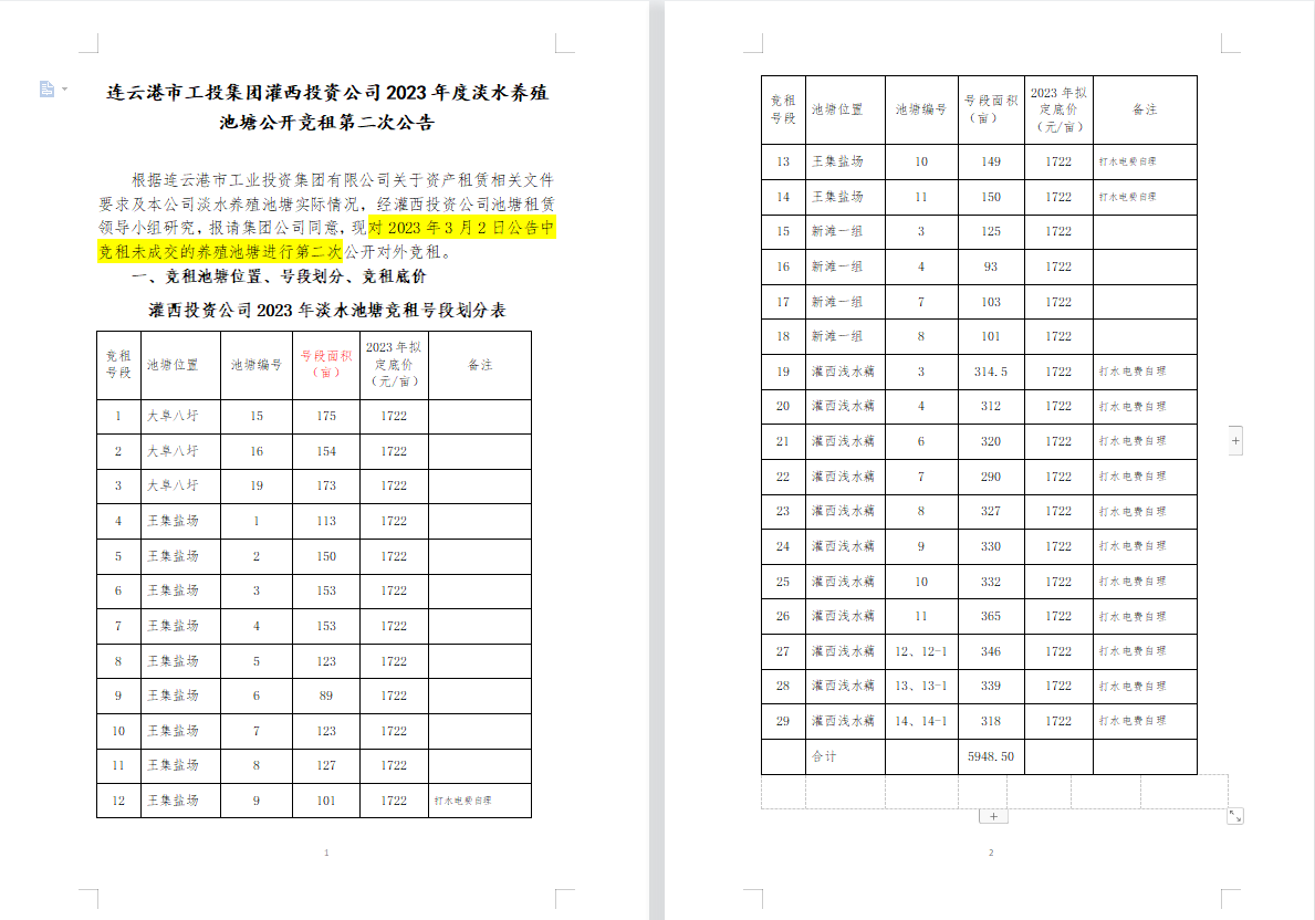 连云港市工投安博(中国)官方灌西投资公司2023年度淡水养殖池塘公开竞租第二次公告