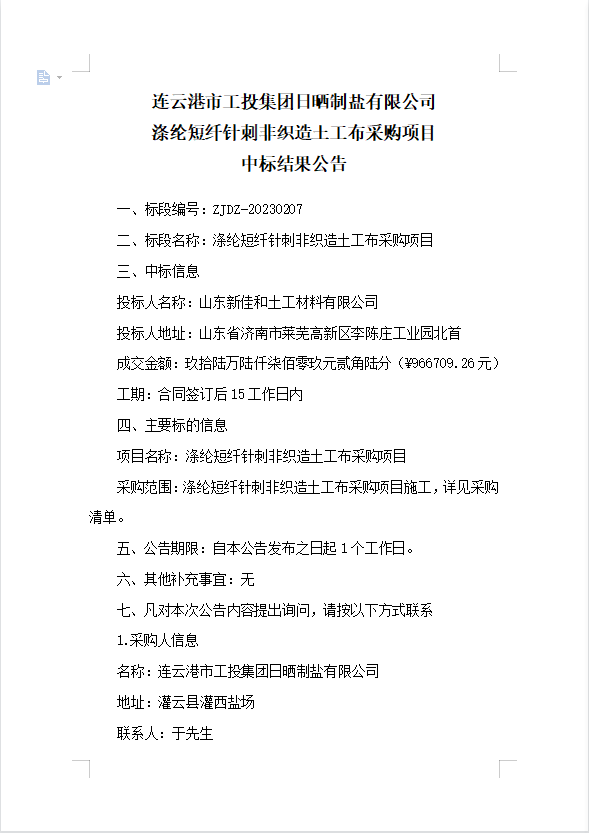 连云港市工投安博(中国)官方日晒制盐有限公司涤纶短纤针刺非织造土工布采购项目中标结果公告