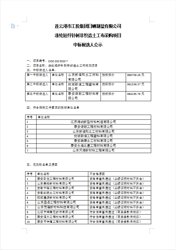 连云港市工投安博(中国)官方日晒制盐有限公司涤纶短纤针刺非织造土工布采购项目中标候选人公示