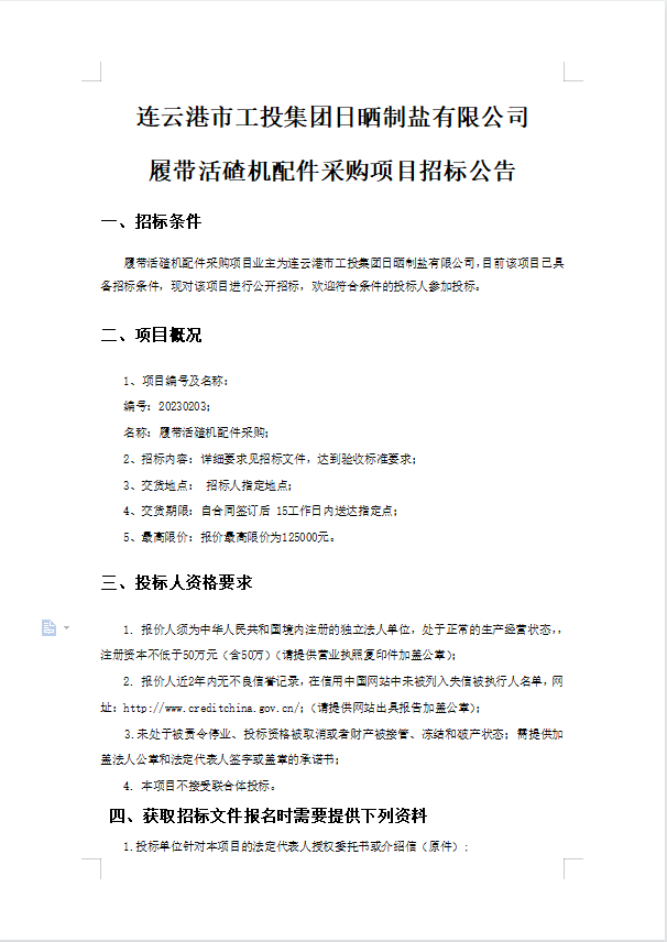 连云港市工投安博(中国)官方日晒制盐有限公司履带活碴机配件采购项目招标公告