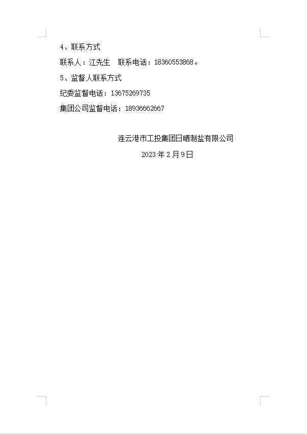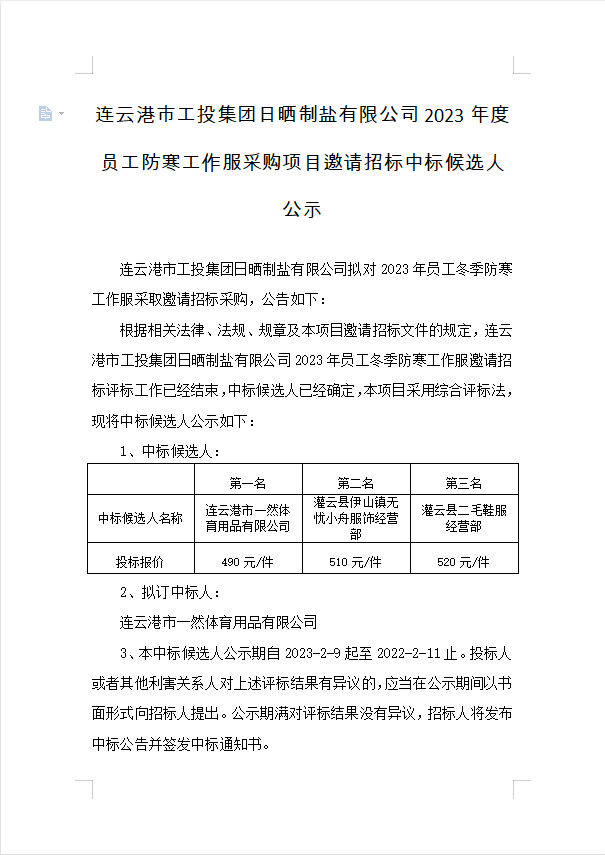 连云港市工投安博(中国)官方日晒制盐有限公司2023年度员工防寒工作服采购项目邀请招标中标候选人公示
